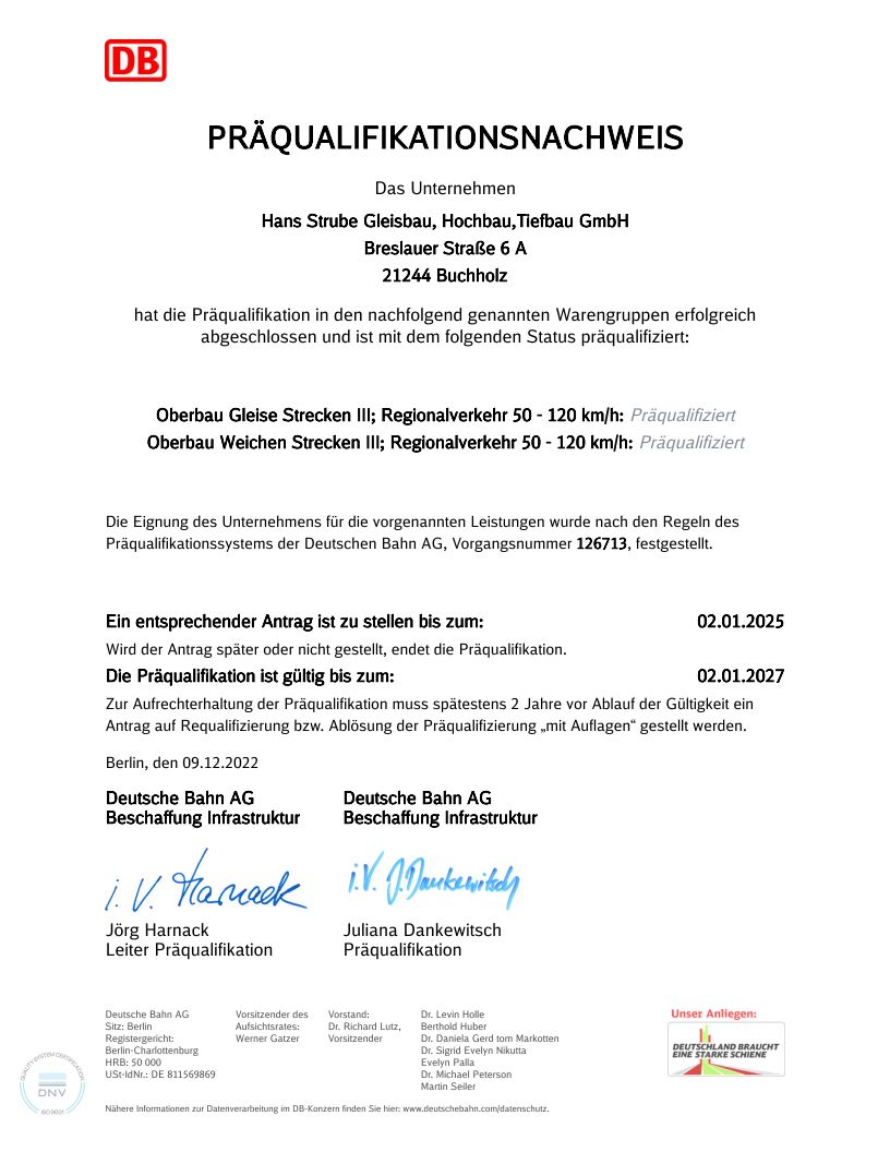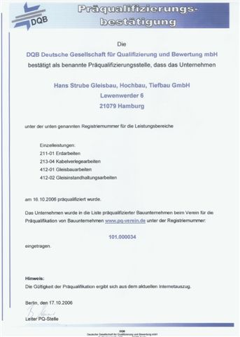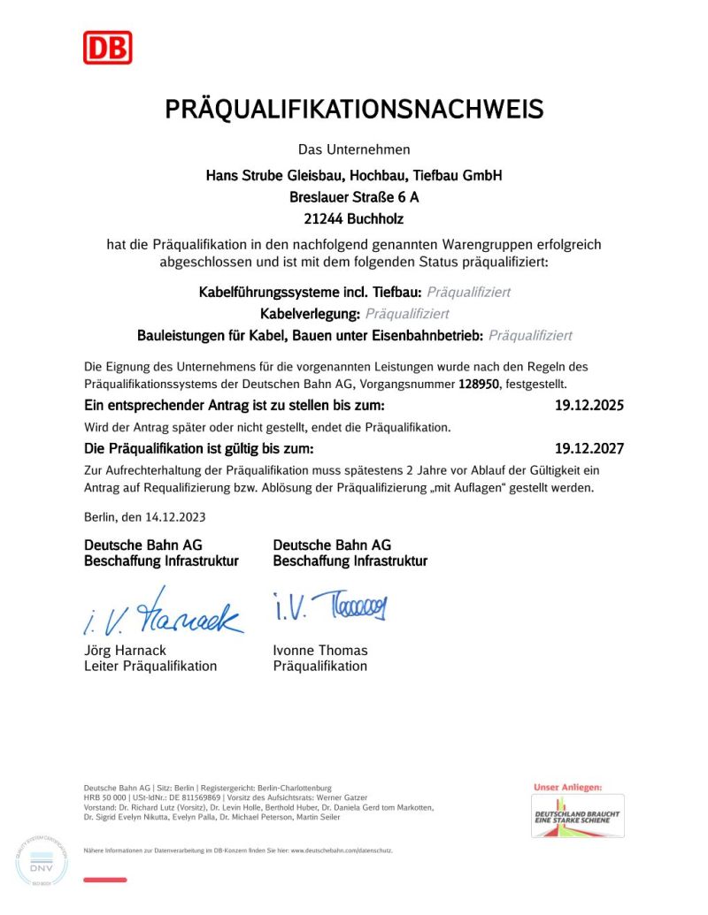 - DBQ Präqualifikationsnachweis Erd-, Kabelverlege, Gleisbau- und Gleisinstandhaltungsarbeiten