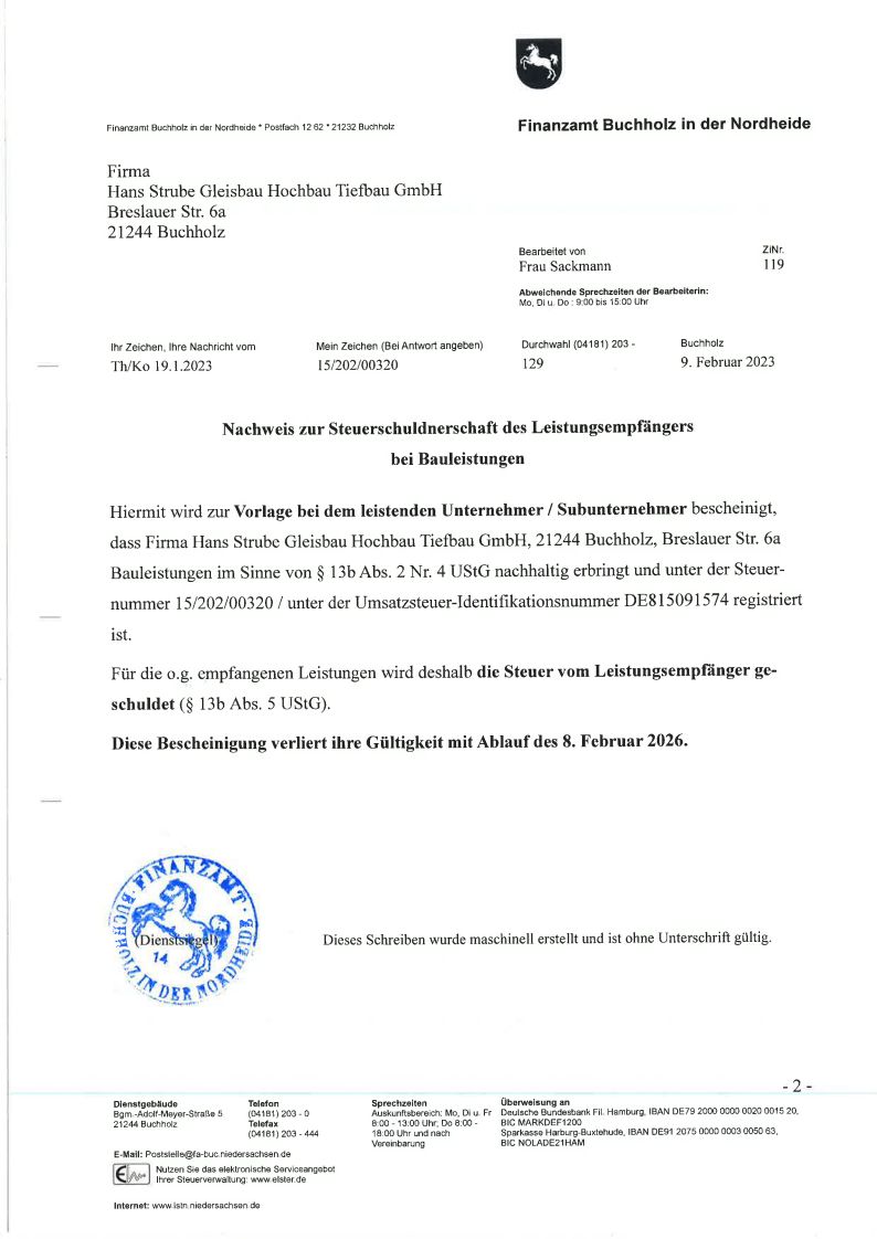 - Nachweis zur Steuerschuldnerschaft des Leistungsempfängers bei Bauleistungen